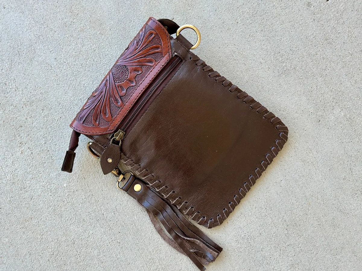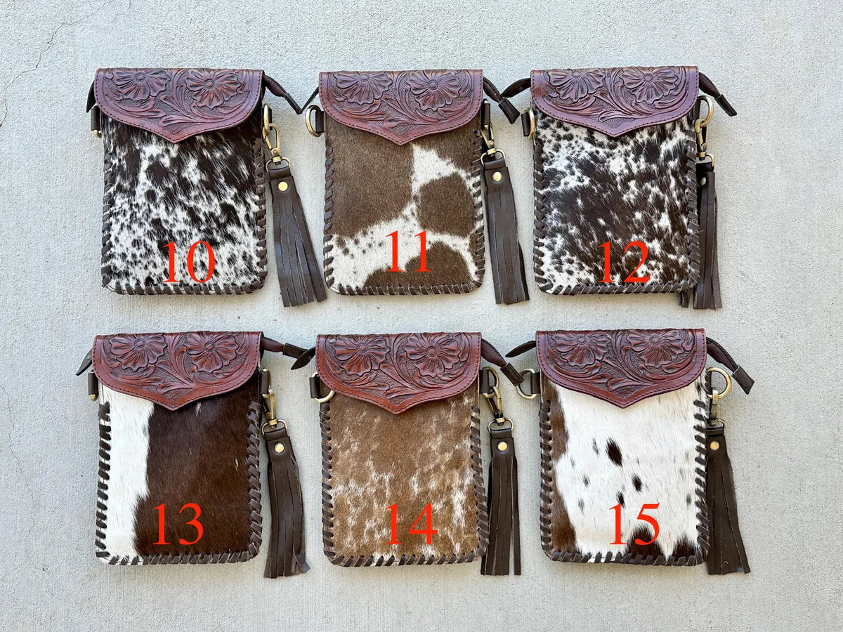 Cowhide Phone Crossbody Bag: Tooled Leather Flap, Western Rodeo Clutch purse