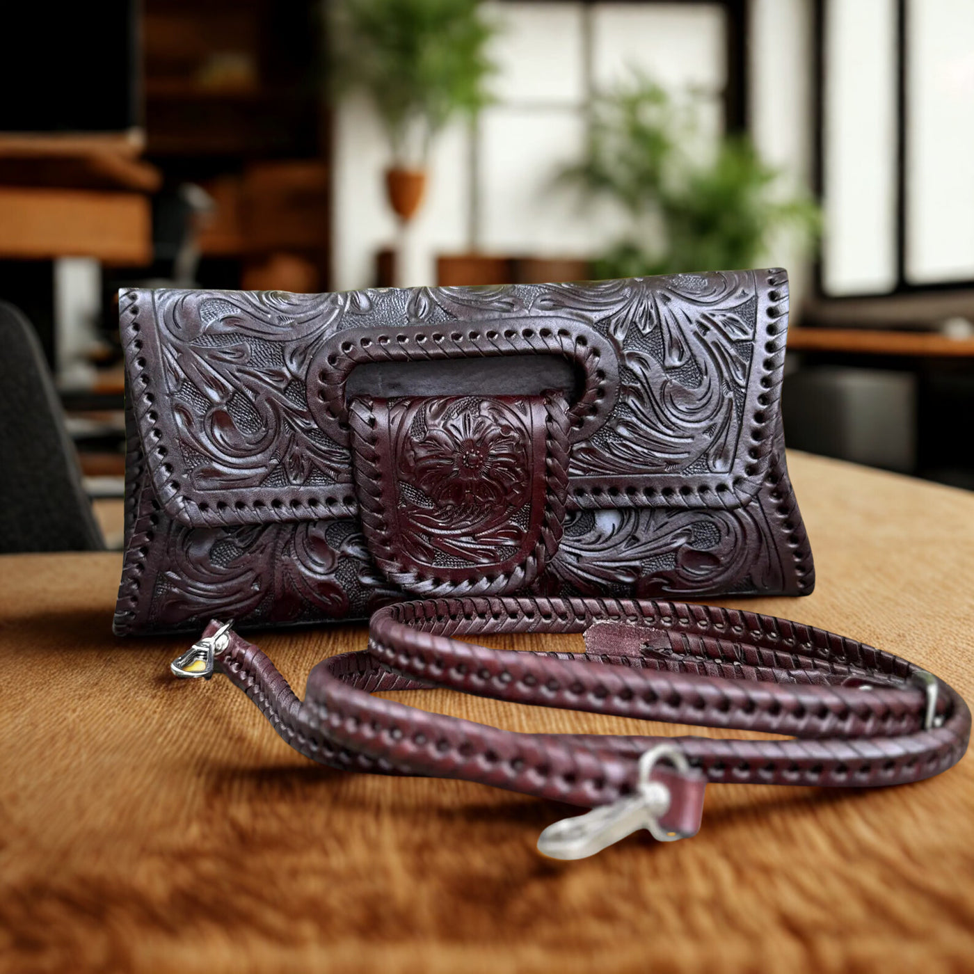 Hand-Tooled Leather Clutch Crossbody Small Bag, Western Boho Style, vintage bag, cowgirl style bag, brown leather bag, Mexican purse - Floral