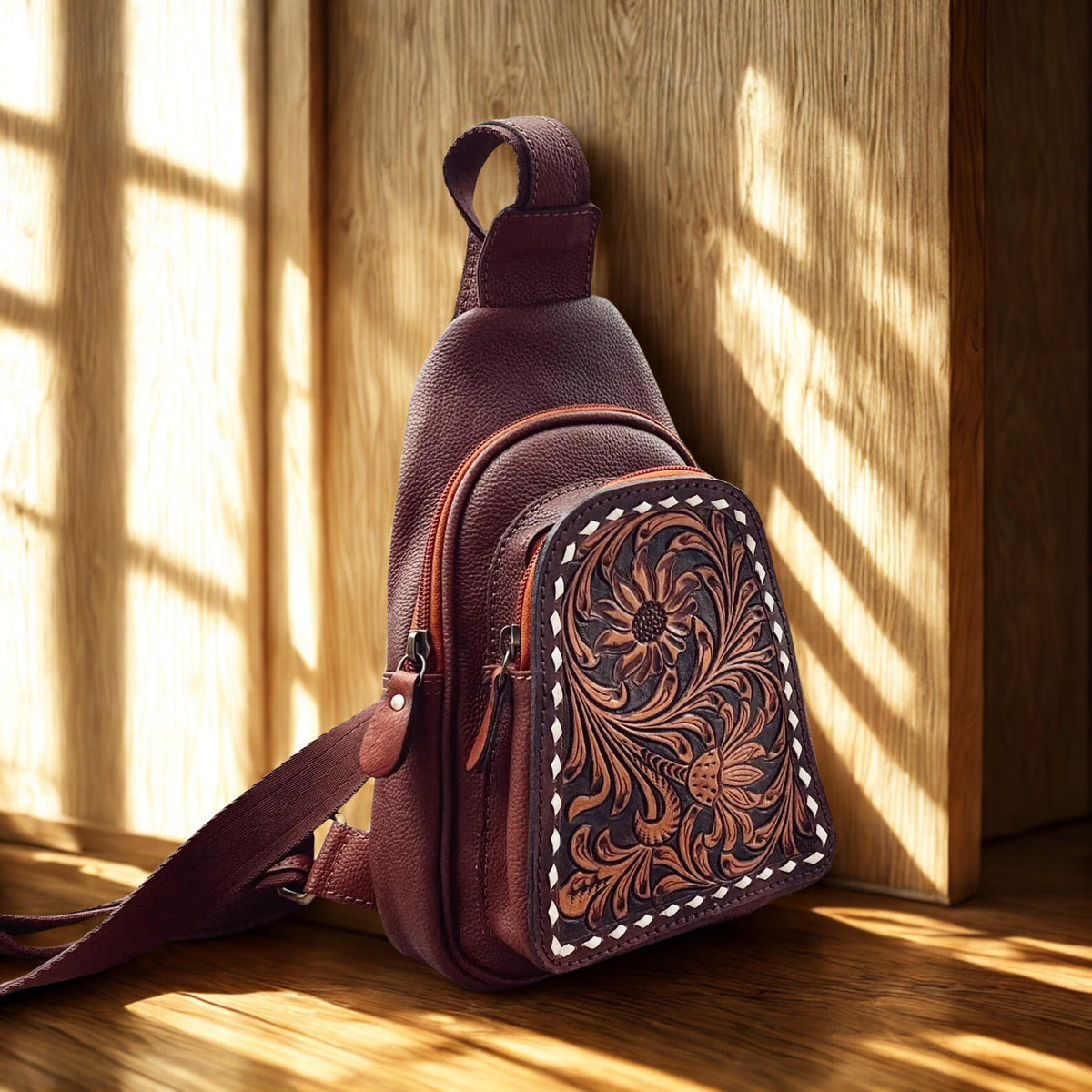 Handmade Hand-Tooled Leather Crossbody Bag.