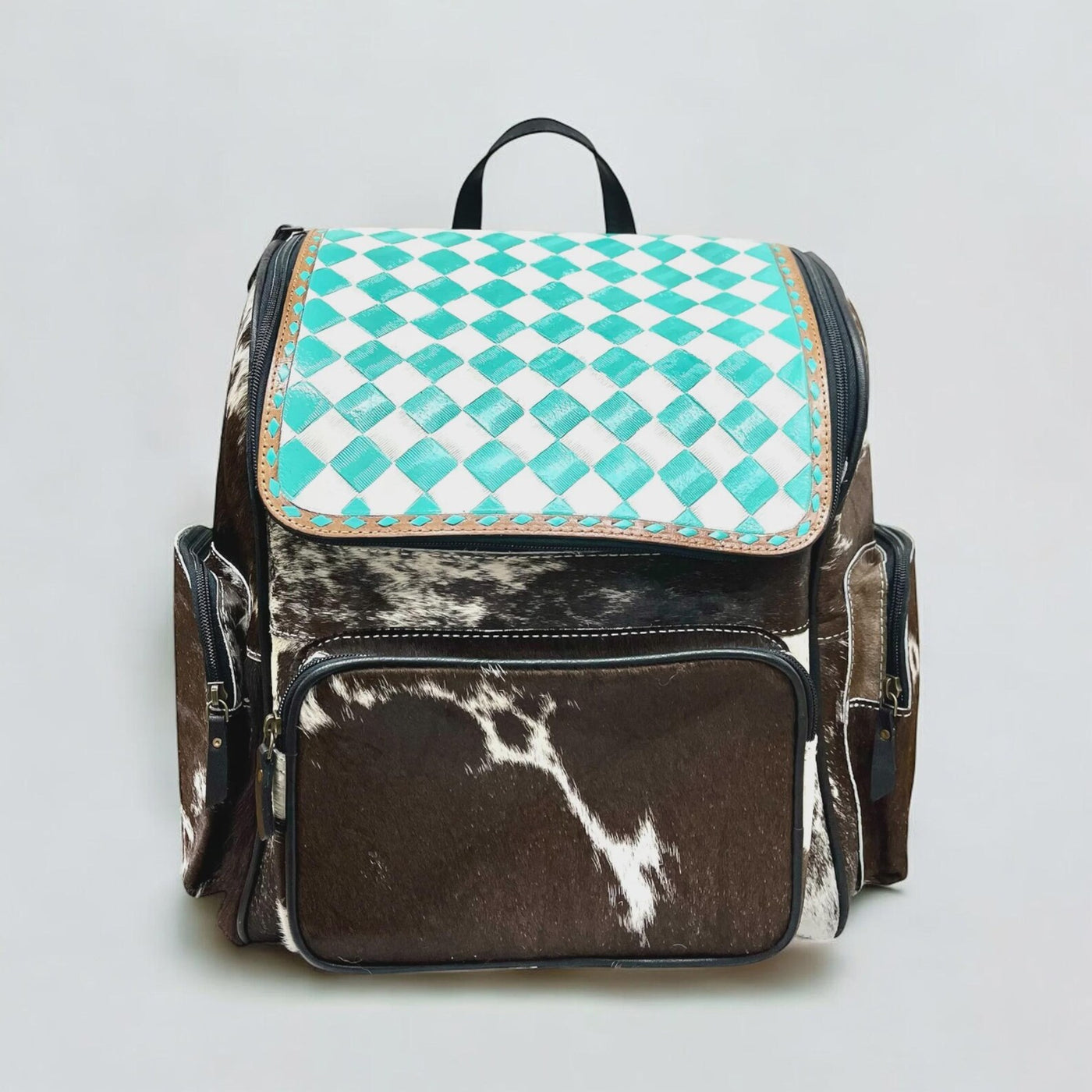 Make a statement with our exclusive Turquoise Checker Leather Backpack. Handcrafted with high-quality leather and genuine cowhide. Featuring a bold Turquoise checker design, this backpack is perfect for anyone who loves western-inspired fashion and wants to stand out from the crowd.