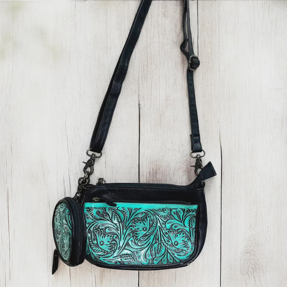 Turquoise tooled leather crossbody bag - Handmade leather women purse