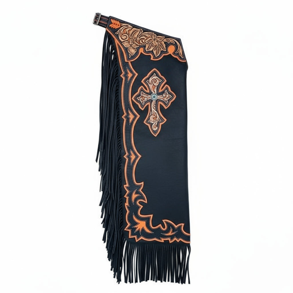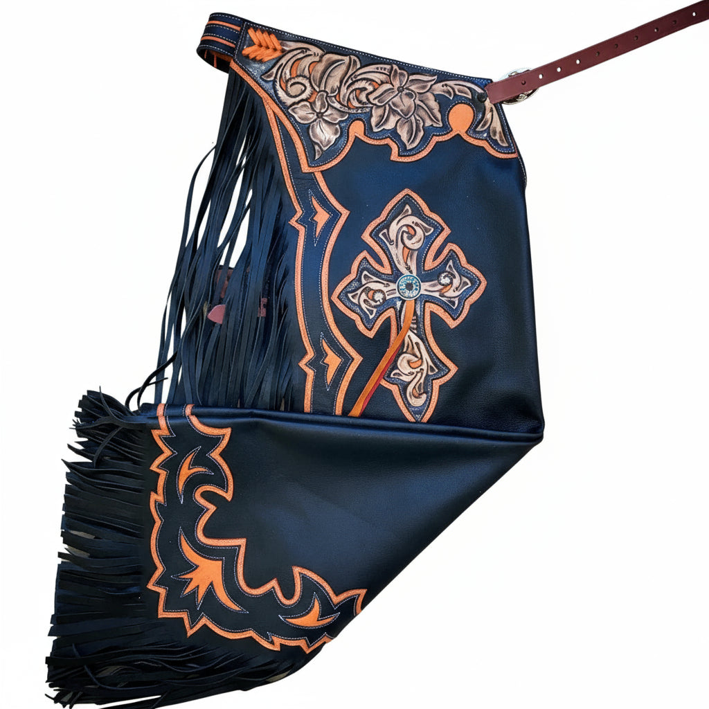 Ride with confidence in our Rodeo Chaps, expertly handcrafted from premium leather for durability, comfort, and bold Western style. Designed for bull riders who value lightness and sophistication, this model features a unique Cross thigh design that sets it apart in the arena.